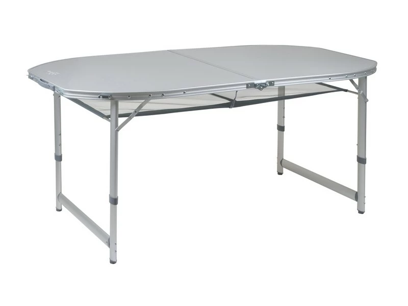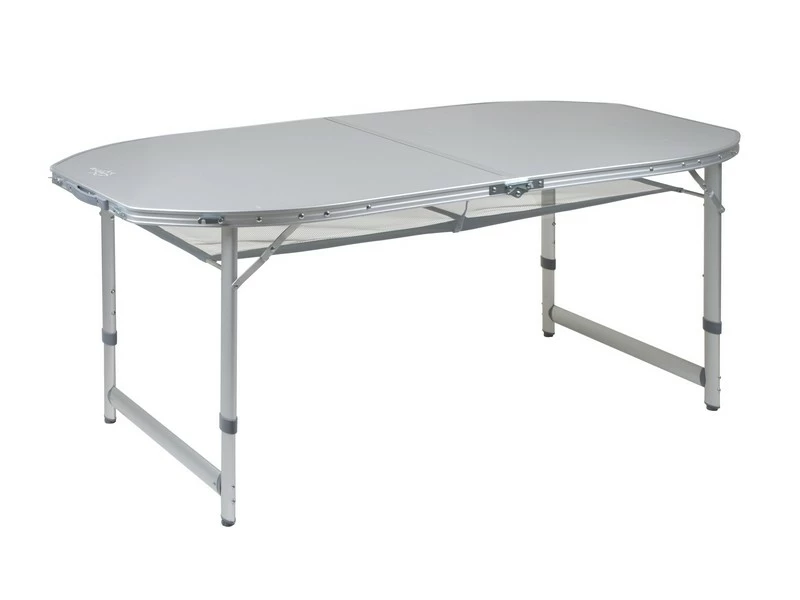 Een stabiele ovalen campingtafel met een watervast en hittebestendig tafelblad. Deze tafel heeft verstelbare poten, stelschroeven voor extra fijnstelling en een deelbaar tafelblad. Hierdoor is de tafel eenvoudig op te vouwen tot koffermodel. Gemaakt van lichtgewicht aluminium met een watervast en hittebestendig tafelblad. De poten zijn in 3 verschillende hoogtes verstelbaar (55/65/70 cm). Onder het tafelblad is een net bevestigd om spullen op te bergen. Ingeklapt (lxbxh): 80x75x7cm.