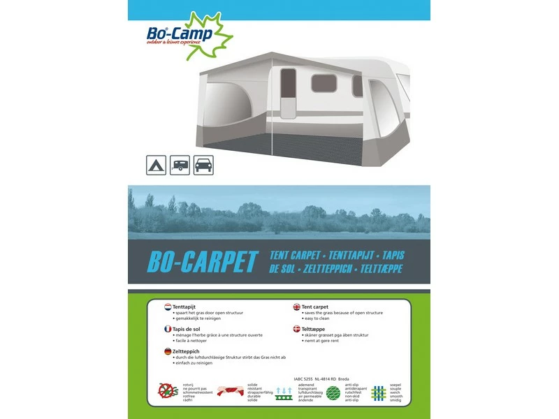 Extra stevig tenttapijt. Dit tapijt is zeer solide, rotvrij, duurzaam, soepel, elastisch, wasbaar op 30 graden en licht van gewicht. Blijft goed liggen door de antislip en spaart gras door de open structuur. Voorzien van een polyester kern met een extra zware coating. Inclusief handige draagtas.