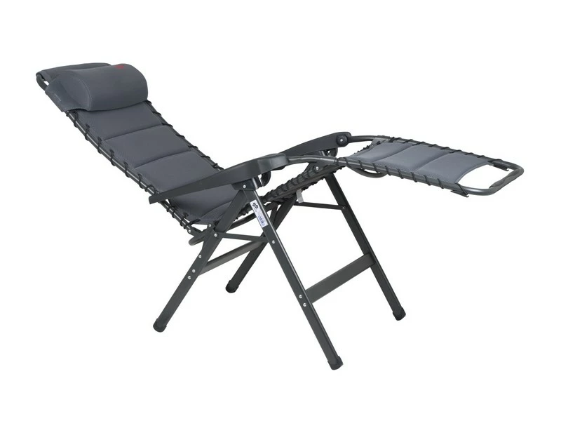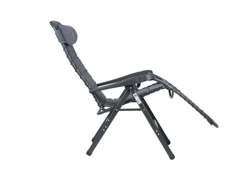 Een zeer luxe en comfortabele relaxstoel met hoofdkussen. Deze stoel biedt maximaal comfort doordat de stoel traploos verstelbaar is. Daarnaast is deze stoel voorzien van een gepolsterde 3D stof welke is bevestigd door middel van elastiek. De comfortabele vulling van deze stof is extra luchtdoorlatend en houdt geen vocht vast. Hierdoor is deze stoel sneller droog dan andere stoelen met een traditionele schuimvulling. Daarnaast zorgt de afwerking voor een stijlvolle uitstraling. Zowel de rugleuning als de armleggers zijn ergonomisch gevormd en de is stoel voorzien van een remsysteem om de stoel in iedere gewenste positie te fixeren. De stoel is voorzien van een geanodiseerd H-frame voor extra stabiliteit en stevigheid. De stoel heeft een extra brede, een extra diepe en een extra hoge zit. Ingeklapt is deze stoel zeer compact en daardoor gemakkelijk mee te nemen in de meegeleverde opbergtas
