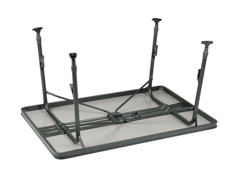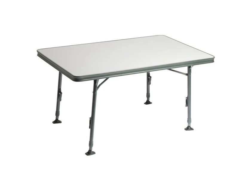 Een luxe en stijlvolle tafel. Deze lichtgewicht campingtafel is voorzien van een hittebestendig en watervast tafelblad en heeft een extra verstevigde aluminium constructie. Daarnaast zorgt de afwerking van de poten en van de tafelrand voor een stijlvolle uitstraling. De tafel beschikt over traploos verstelbare poten (52-74 cm) die zijn in te klappen, hierdoor is deze tafel eenvoudig en compact te vervoeren (ingeklapt (lxbxh): 110x70x3,8 cm). Door dat deze tafel beschikt over stabilisatie voeten, staat hij stabiel op elke ondergrond. Maximale belasting: 50 kilogram.