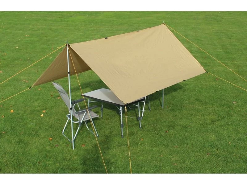 Het materiaal zorgt ervoor dat je onder de tarp heerlijk comfortabel kunt zitten, beschut van de warmte van de zon of de regen. Alle hoekpunten zijn versterkt zodat de tarp goed afgespannen kan worden en het klapperen door de wind het materiaal niet kapot maakt.(uiteraard bij sterke wind de tarp niet gebruiken).